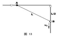 (本题18分)如图所示,直角形的刚性杆被固定,水平和竖直部分均足够长。质量分别为m1和m2的A、B两个有孔小球,串在杆上,且被长为L的轻绳相连。忽略两球的大小,初态时,认为它们的位置在同一高度,且绳处于拉直状态。现无初速地将系统释放,忽略一切摩擦,试求B球运动L/2时的速度v2