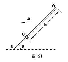 13.(本题18分)如图所示,与水平面成θ角的AB棒上有一滑套C ,可以无摩擦地在棒上滑动,开始时与棒的A端相距b ,相对棒静止。当棒保持倾角θ不变地沿水平面匀加速运动,加速度为a(且a>gtgθ)时,求滑套C从棒的A端滑出所经历的时间。