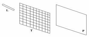 9、如图所示,L为水平放置的点亮的8w日光灯,T为一藤椅的竖直靠背,横藤条与日光灯管平行,竖藤条相互垂交织,它们之间是透空方格,P是与藤条靠背平行的白屏。现将屏从紧贴椅背处慢慢向远处(图中右方)平移,从屏上将依次看到( )