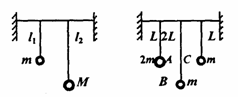 如下图所示,甲、乙两单摆摆长分别是L1和L2,悬挂在同一根细线上,若把m偏离平衡位置一个很小的角度,放手后m作简谐运动,则: