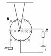 12.铜盘的半径为r,竖直悬挂,可绕O点无摩擦地滑动,匀强磁场B垂直于圆盘, 盘边缘绕着细长线,线一端挂着质量为m的物体,电阻R与电源ε按右图示方法接到圆盘上,现欲使重物以速度v匀速提升,问所用电源电动势为多 少?(设圆盘的质量不计,电阻不计,导线与圆盘连接良好)。