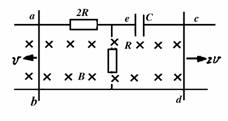16.如右图示,两个电阻器的阻值分别为R和2R,其余电阻不计,电容器的电容 量为C,匀强磁场的磁感应强度的大小为B,方向垂直于纸面向里,金属棒ab、cd的长度均为l。当棒ab以速度v向左切割磁感 线运动,金属棒cd以速度2v向右切割磁感线运动时,电容C的电量为多大?哪一 个极板带正电?