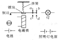 硫化镉(CdS)晶体是一种光敏材料,用它做成的光敏电阻有一特性:被光照射时电阻很小,当将光遮住时电阻很大.用它来控制照明灯,要求白天灯不亮,夜晚灯亮.请将图示元件连接成符合上述要求的电路.图中电磁铁上方是带铁块的铜片,其右端上下各有一组开关,当电磁铁中无电流时,弹簧将铜片拉起,使其上方的开关(双箭头a、b表示)闭合;当电磁欣中有电流时,铁块受磁力作用拉下铜片,下方的开关(双箭头c、d表示)闭合.