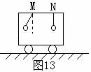 7. 如图13所示,一向右运动的车厢项上悬挂两个单摆M和N,它们只能在图示的平面内摆动。某一瞬间时出现图示情景,由此可知车厢的运动及两个单摆相对于车厢运动的可能情况是