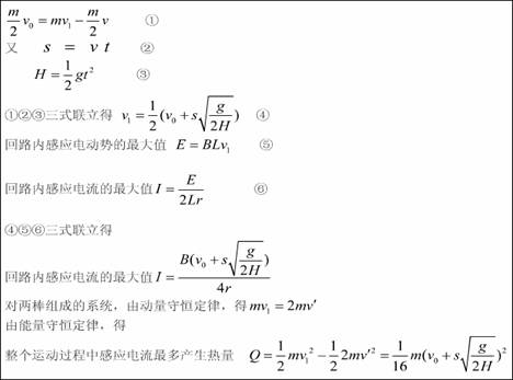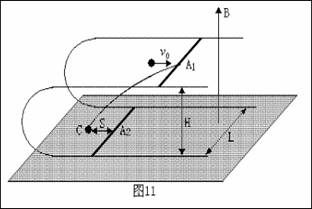 16. (16 分)如图 11所示,在磁感应强度大小为 B、方向垂直向上的匀强磁场中,有一上、 下两层均与水平面平行的“U”型光滑金属导轨,在导轨面上各放一根完全相同的质量为m 的匀质金属A1和A2,开始时两根金属杆位于同一竖起面内且杆与轨道垂直。设两导轨面 相距为 H,导轨宽为 L,导轨足够长且电阻不计,金属杆单位长度的电阻为 r。现有一质量 为m /2的不带电小球以水平向右的速度v0撞击杆A1的中点,撞击后小球反弹落到下层面上的C点。C 点与杆A2初始位置相距为S。求: