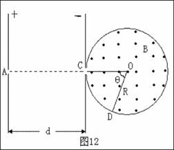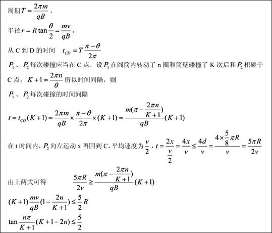 18.(17 分)在光滑绝缘的水平桌面上,有两个质 量均为m,电量为+q 的完全相同的带电粒子 P1 和 P2 ,在小孔 A处以初速度为零先后释放。在平 行板间距为d 的匀强电场中加速后,P1从C处对着圆心进入半径为 R 的固定圆筒中(筒壁上的小 孔 C 只能容一个粒子通过),圆筒内有垂直水平面向上的磁感应强度为 B 的匀强磁场。P1每次与筒壁发生碰撞均无电荷迁移,P1进入磁场第一次与筒壁碰撞点为 D,∠COD=θ ,如图12所示。延后释放的P2,将第一次欲逃逸出圆筒的P1正碰 圆筒内,此次碰撞刚结束,立即改变平行板间的电压,并利用P2与P1之后的碰撞,将P1限制在圆 筒内运动。碰撞过程均无机械能损失。设d=5πR/8,求:在P2和P1相邻两次碰撞时间间隔内,粒子P1与筒壁的可能碰撞次数。