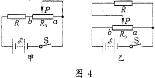 为改变被测电阻两端的电压(或被测电阻中的电流强度),常用滑动变阻器与电源的连接有两种不同的形式,如图4所示,图4甲为限流接法,图4乙为分压接法,这两种接法区别之处是:(L彼测电阻R上的电压调节