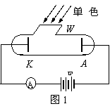 在图1所示的装置中,K为一金属板,A为金属电极,都密封在真空的玻璃管中,W为由石英片封盖的窗口,单色光可通过石英片射到金属板K上,E为输出电压可调的直流电流,其负极与电极A相连,A是电流表,实验发现,当用某种频率的单色光照射K时,K会发出电子(光电效应),这时,即使A、K之间的电压等于零,回路中也有电流。当A的电势低于K时,当