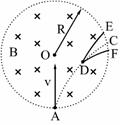 如图所示。在一个半径为R的圆形区域内有一匀强磁场,磁场方向垂直于圆面向里。一个带电粒子从此场边界的A沿指向圆心O的方向进入磁场区域内,粒子将做圆周运动到达磁场边界的C点。但在粒子经过D点时,恰好与一个原来静止在该点的完全相同的粒子碰撞后结合在一起形成新粒子。粒子的重力不计。关于这个新粒子的运动情况,以下判断正确的是
