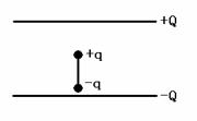10. 一平行板电容器的电容为C,两板间的距离为d,上板带正电,电量为Q,下板带负电,电量也为Q,它们产生的电场在很远处的电势为零。两个带异号电荷的小球用一绝缘刚性杆相连,小球的电量都为q,杆长为l,且l<d。现将它们从很远处移到电容器内两板之间,处于图示的静止状态(杆与板面垂直),在此过程中电场力对两个小球所做总功的大小等于多少?(设两球移动过程中极板上电荷分布情况不变) ( )