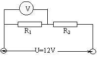 8.两个定值电阻R1、R2串联后接在输出电压U稳定于12V的直流电源上.有人把一个内阻不是远大于R1、R2的电压表接在R1两端如图,电压表的示数为8V。如果把此电压表改接在R2的两端,则电压表的示数将: A.小于4V; B.等于4V; C.大于4V;小于8V; D.等于或大于8V.