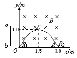 m,金属棒ab长1.5m,以速度v=5.0m/s水平向右匀速运动(b端始终在Ox轴上)。设金属棒与导轨接触良好,摩擦不计,电路中除R1、R2外,其余电阻均不计,求:(1)金属棒在导轨上运动时R1的最大功率;(2)金属棒在导轨上运动时,从x=0到x=3m的过程中,外力必须做多少功?