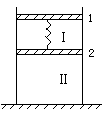 (13分)如图所示,一圆筒形气缸的横截面积S=1.0×10-3m2,直立在地面上,内有质量m1=2.0kg和m2未知的两活塞1、2封有两部分理想气体Ⅰ和Ⅱ,两活塞间用劲度系数k=200N/m的轻弹簧相连,当温度T1=300K时,弹簧恰为原长,气体Ⅰ和Ⅱ的高度分别为l1=0.70m和l2=0.30m,设外界大气压强P0=1.0×105Pa,不计活塞与气缸间的摩擦,当外界温度缓慢升至T1’=400K时,气体Ⅰ和Ⅱ的高度各为多少?(g取10m/s2)