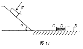18.(10分)如图17示,粗糙斜面与光滑水平面通过半径可忽略的光滑小圆弧平滑连接,斜面倾角α=370,A、B是两个质量均为 m=1㎏的小滑块(可视为质点),C为左端附有胶泥的质量不计的薄板,D为两端分别连接B和C的轻质弹簧。当滑块A置于斜面上且受到大小F=4N,方向垂直斜面向下的恒力作用时,恰能向下匀速运动。现撤去F,让滑块A从斜面上距斜面底端L=1m处由静止下滑,若g取10m/s2,sin370=0.6,cos370=0.8。