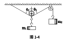 如图1-4所示的装置中,绳子与滑轮的质量不计,摩擦不计,两个物体的质量分别为m1和m2 ,动滑轮两边的绳子与竖直方向的夹角分别为θ1和θ2 ,装置处于静止状态,则( )