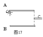 如图17所示是一种β射线管,由两平行金属板A、B和平行于金属板细管C组成. 放射源O在A极板左端,可以向各个方向发射不同速度的质量为m的β粒子. 若极板长为L,间距为d,当A、B板加上电压U时,只有某一速度的β粒子能从细管C水平射出,细管C离两板等距,求这一速度的大小.(已知元电荷为e)