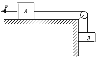 (10分)如图所示,物体A、B的质量均为m,物体与接触面间的动摩擦因数均为μ,物体B所接触的面是竖直的,滑轮的摩擦不计,欲使物体A在水平面上向左做匀速直线运动,则水平施于物体A的力F应为多大?