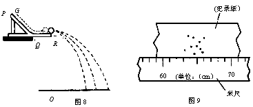 12.某同学用图8所示装置通过半径相同的A、B两球的碰撞来验证动量守恒定律,图中PQ是斜槽,QR为水平槽,实验时先使A球从斜槽上某一固定位置G由静止开始滚下,落到位于水平地面的记录纸上,留下痕迹,重复上述操作10次,得到10个落点痕迹,再把B球放在水平槽上靠近槽末端的地方,让A球仍从位置G由静止开始滚下,和B球碰撞后,A、B球分别在记录纸上留下各自的落点痕迹,重复这种操作10次,图8中O点是水平槽末端R在记录纸上的垂直投影点,B球落点痕迹如图9所示,其中米尺水平放置,且平行于G、R、O所在的平面,米尺的零点与O点对齐。