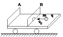 15、如图所示,两块平行金属板A、B带有等量异种电荷,竖直固定在光滑绝缘的小车上,小车的总质量为M,整个装置静止在光滑的水平面上。质量为m、带电量为q的小球以初速度v0沿垂直金属板的方向从B板底部小孔射入,且恰好不与A板相碰,求A、B金属板间的电势差?