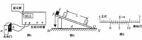 现利用如图2所示装置测量滑块和长1m左右的木板间的动摩擦因数.图中MN是水平桌面,Q是木板与桌面的接触点,1和2是固定在木板上适当位置的两个光电门,与之连接的两个光电计时器没有画出.此外在木板顶端的P点还悬挂着一个铅锤,让滑块从木板的顶端滑下,光电门1、2各自连接的计时器显示的挡光时间分别为5.0×10-2s和2.0×10-2s.用游标卡尺测量小滑块的宽度d,卡尺示数如图3所示.