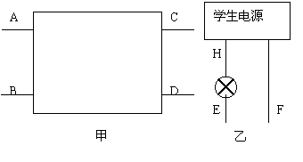 如图所示,A、B、C、D为一个电学黑箱的四个接线柱。已知A、B间没有直接接入任何电学元件,A、C间、C、D间和B、D间分别接入一个电学元件。某同学用一只多用电表和一个连接着灯泡的学生电源(如图乙),分别对黑箱进行如下操作:①用多用电表的直流电压挡测量A、B、C、D任意两点之间均无电压。②用多用电表的欧姆挡对A、C接线柱进行正、反向测试,发现欧姆表的指针均先摆向“0Ω”端,再反回来退到“∞”端,且越退越慢;C、D间的正、反电阻相同且都很小;B、D间的正向电阻很小,而反向电阻却很大。③将图乙中的学生电源拨到直流挡,H接正极,F接负极。将E、F分别接B、D时,灯正常发光;E、F分别接D、B时,灯不亮。将E、F分别接C、D和D、C时,都能看到灯是逐渐亮起来。将E、F接A、C和C、A时,灯均不亮。请你根据以上叙述,在甲图中画出黑箱中的电路。