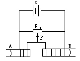为滑动变阻器,P为滑动触头,导体环A、B分别套在两个相同的螺线管两端,螺线管绕线方向不清,电阻均为