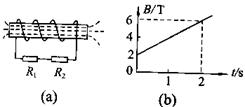 (12分)如图所示的螺线管的匝数n=1500,横截面积S=20cm2,电阻r=1.5Ω,与螺线管串联的外电阻R1=10Ω,R2=3.5Ω。若穿过螺线管的磁场的磁感应强度按图(b)所示的规律变化,计算R1上消耗的电功率。