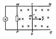 18.(13分)如图所示,MN、PQ是两条水平放置彼此平行的金属导轨,匀强磁场的磁感线垂直导轨平面.导轨左端接阻值R=1.5Ω的电阻,电阻两端并联一电压表,垂直导轨跨接一金属杆ab,ab的质量m=0.1kg,电阻r=0.5Ω.ab与导轨间动摩擦因数μ=0.5,导轨电阻不计,现用F=0.7N的恒力水平向右拉ab,使之从静止开始运动,经时间t=2s后,ab开始做匀速运动,此时电压表示数U=0.3V.重力加速度g=10m/s2.求: