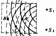 S1、S2是两个相干波源,在右图中分别以S1、S2为圆心作出两组同心圆弧,分别表示在同一时刻两列波的波峰和波谷。实线表示波峰,虚线表示波谷。在图中方框内标出了三个点A、B、C,这三个点中,振动加强的点是