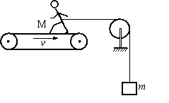 测定运动员体能的一种装置如图所示,运动员的质量为M,绳拴在腰间沿水平方向跨过滑轮(不计滑轮摩擦和质量),绳的另一端悬吊的重物质量为m,人用力向后蹬传送带而人的重心不动,传送带以速度v向后匀速运动(速度大小可调)。最后可用