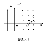 21.如图模2-16所示,图中y轴右侧为磁感应强度为B的匀强磁场,y轴的左侧为电场强度为E的匀强电场,现有一电子从x轴上某点A与x油成60°角的方向以速度v0飞进磁场中运动,继而垂直于y轴飞进电场中,问: