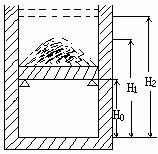 一个质量可不计的活塞将一定质量的理想气体封闭在上端开口的直立圆筒气缸内,活塞上堆放着铁砂,最初活塞搁置在气缸内壁的固定卡环上,气柱的高度为H0,压强等于大气压强r0,现对气体缓慢加热,当气体温度升高了ΔT=60k时,活塞及铁砂开始离开卡环面上升,继续加热直到气柱高度为H1=1.5H0,此后在保持温度不变的条件下逐渐取走铁砂,直到铁砂全部取走气柱高度变为H2=1.8H0,求此时气体的温度,不计活塞与气缸之间的磨擦。
