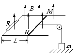 (15分)如图,不计电阻的U形导轨水平放置,导轨宽l=0.5m,左端连接阻值为0.4Ω的电阻R。在导轨上垂直于导轨放一电阻为0.1Ω的导体棒MN,并用水平轻绳通过定滑轮吊着质量为m=2.4g的重物。图中L=0.8m。开始重物与水平地面接触并处于静止。整个装置处于竖直向上的匀强磁场中,磁感应强度B0=0.5T,并且以