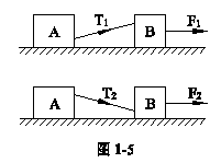 6、如图1-5所示,A、B两木块放在水平面上,它们之间用细线相连,两次连接情况中细线倾斜方向不同但倾角一样,两木块与水平面间的摩擦系数相同,先后用水平力F1和F2拉着A、B一起匀速运动,则( )