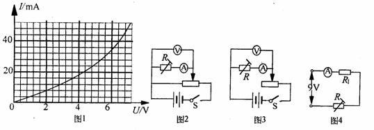 (1)为了通过测量得到图1所示I--U关系的完整曲线,在图2和图3两个电路中应选择哪一个?并简要说明理由。(电源电动势为9V,内阻不计,滑动变阻器的阻值为0-100Ω)。