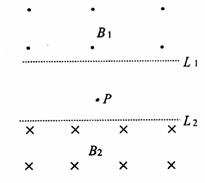 16.(1 5分)如图所示,虚线L1和L2平行,在L1的上方和L2的下方有磁感应强度分别为B1、B2的方向相反的匀强磁场,L1和L2之间有一点P,P点到L1的距离为d,到L2的距离为d/2,d=9cm,一带正电的粒子(重力不计)从P点开始运动,进入磁场B1后受到的洛仑兹力大小为1.6X 10-3N,偏转240°角后又回到P点,再向下进入磁场B 2,在磁B 2中偏转后正好又回到P点,如此往复.已知每次从进入磁场B1到穿出磁场B1所用时间是0.002πs