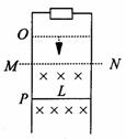 17.(15分)如图所示,平行金属导轨竖直放置,仅在虚线MN下面的空间内存在着磁感应强度随高度变化的磁场(在同一水平线上各处磁感应强度相同),磁场方向垂直纸面向里,导轨上端跨接一定值电阻R,质量为m的金属棒两端套在导轨上并可在导轨上无摩擦滑动.导轨和金属棒的电阻不计,将导轨从O处由静止释放,进入磁场后正好作匀减速运动,刚进入磁场时速度为V,到达P处时速度为v/2,O点和P点到MN的距离相等.