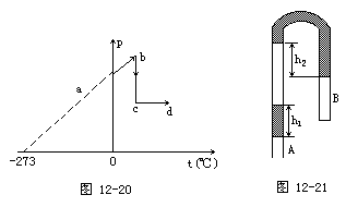 12.如图12-21所示的U形管,A、B都沿竖直方向,A端开口,B端封闭,管内水银柱分两部分,A管下部水银柱长h1,B管内水银面与A管内上水银面间的高度差为h2,大气压强为p0,B管内被封闭的空气的压强为p,则
