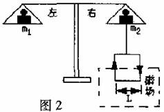 5.如图2所示的天平可用来测定电磁感应强度B,天平的右臂下面挂一个矩形线圈,宽为 L,共N匝,线圈的下部悬在有电流I(方向如图2)时,在天平两边加上质量各为m1、m2的砝码,天平平衡,当电流反向(大小不变)时,右边再加上质量为m的砝码后,天平重新平衡,由此可知