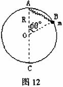 (13分)一个质量为m=0.20kg的小球系在轻质弹簧的一端,且套在光滑直立的圆环上,弹簧的上端固定于环的最高点A,环的半径R=0.50m,弹簧的原长l0=0.50m,劲度系数为4.8N/m。如图所示,让小球从图12中位置B点由静止开始滑动到最低点C时,弹簧的弹性势能EP=0.60J。求: