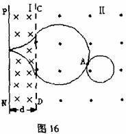 (15分)如图16所示,区域I和区域Ⅱ的匀强磁场磁感应强度大小相等,方向相反。在区域Ⅱ的A处有一静止的原子核发生α衰变,生成的新核电量为q(大于α粒子电量),新核和α粒子的运动轨迹如图,其中一个由区域Ⅱ进入区域I,与光滑绝缘挡板PN垂直相碰后(PN与磁场分界线CD平行),经过一段时间又能返回到A处,已知区域I的宽度为d,试求新核和α粒子的轨道半径。(基本电荷电量为e)