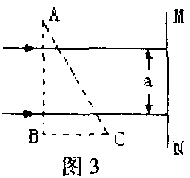 5.如图3所示,MN是暗室墙上的一把直尺,-束宽度为a的平行白光垂直射向MN,现将一横截面积是直角三角形的玻璃三棱镜放在图中虚线所示位置,截面直角边AB与MN平行,顶角A为30º,则放上三棱镜后,射到直尺上的光将