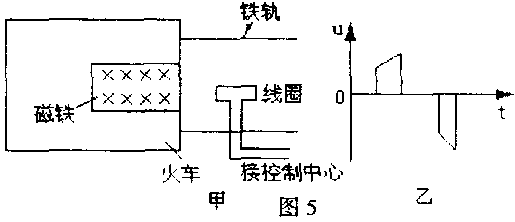 10.铁路上使用一种电磁装置向控制中心传输信号以确定火车的位置。能产生匀强磁场的磁 铁,被安装在火车首节车厢下面,如图5(甲)所示(俯视图)。当它经过安放在两铁轨间的线圈时,便会产生一电信号,被控制中心接收。当火车通过线圈时,若控制中心接收到的线圈两端的电压信号为图5(乙)所示,则说明火车在做