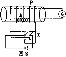 15.(11分)如图8所示,一种测量通电螺线管内部磁感强度的装置中,把一个很小的测量线圈A放在待测处,A线圈与测量电量的电表G相联。当双刀双掷开关K使螺线管P的电流反向时,A线圈中就产生感应电动势,从而引起电量的迁移,由G表测出这个电量,就可以算出A线圈所在处的磁感强度。已知A线圈共有N匝,A线圈的直径为d,它和G表组成的串联电路的总电阻为R,在K反向时,G表测得电路中的电量q,根据以上数据,推导被测处的磁感强度B的值。