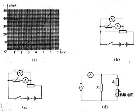 (1) 为了通过测量得到图(a)所示I-U关系的完整曲线,在图(b)和图(c)两个电路中应选择的是图_______;简要说明理由:__________________________________________.(电源电动势为9V,内阻不计,滑线变阻器的阻值为0-100W).
