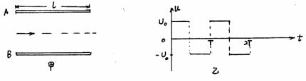 如图甲所示,A、B表示真空中水平放置相距为d的两平行金属板,板长为L,两板间加电压后电场可视为匀强电场。现在A、B两板间加上如图乙所示的周期性交变电压。在t=T/4时,恰有一质量为m、电量为q的粒子在板间中央沿水平方向以速度v0射入电场,忽略粒子重力。下列关于粒子运动状态的表述正确的是:( )