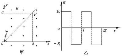 如图(甲)所示,x≥0的区域内有如图乙所示大小不变、方向随时间周期性变化的磁场,磁场方向垂直纸面向外时为正方向。现有一质量为m、带电量为q的正电粒子,在t=0时刻从坐标原点O以速度v沿着与x轴正方向成75°角射入。粒子运动一段时间到达P点,P点坐标为(a,a),此时粒子的速度方向与