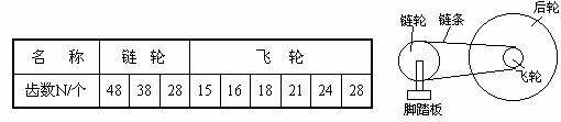 某种变速自行车,有六个飞轮和三个链轮,如图。链轮和飞轮的齿数如下表所示,后轮直径约为660mm。人骑该车行进速度为4m/s时,脚踩踏板作匀速圆周运动的角速度最小是多少?(最后结果取二位有效数字)