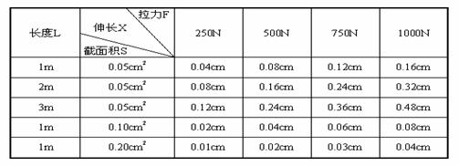 ⑴根据测试结果,推导出线材伸长X与材料的长度L、材料的截面积S及拉力F的函数关系。