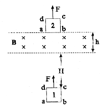 4、在平等虚线范围内有B=1T,高度为h=1m,方向垂直纸面向里的匀强磁场区域,如图所示,线框质量m=0.1kg,电阻R=1Ω,框面跟纸面平行,边长L=1m,原来cd边跟磁场下边缘相距为H,当用一竖直向上的恒力F=21N上提线框,由静止的“1”位置,向上运动穿过磁场区,最后到达“2”位置(ab恰出磁场)。线框平面在运动中保持在竖直平面内,如果cd刚进入磁场时,恰好作匀速运动,求上述整个过程中,外力F所做的功及线框内产生的焦耳热。(g取10m/s2)。